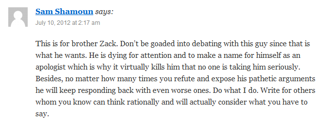 I’ve really got to hand it to Sam, it’s strange that he’s warning his brethren to avoid me like the plague, after and only after he’s engaged with me on that blog. What’s worse is that neither Anthony or him have as of yet, been able to respond to any of my arguments against them, which you can read here and here. It seems as if I must thank Sam Shamoun for placing a Christian missionary embargo on me. The longer he is silent against me and the more he preaches against me, the more it shows his inability to respond to my articles and refutations against his lies. Yet his embargo does not seem to be working.