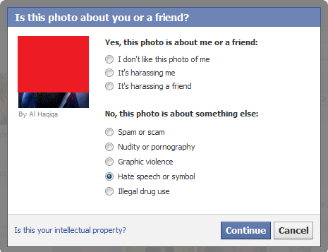 4. Another screen will appear, select, “Hate Speech or Symbol“. Then click, “Continue“.