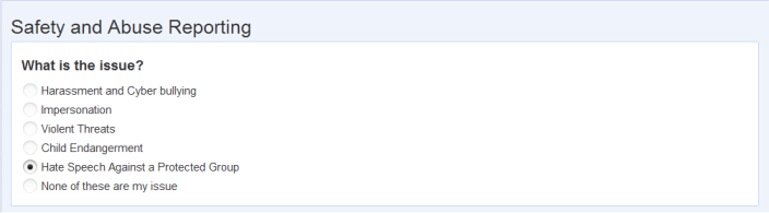 1. You will be taken to this page by clicking the above link, you will check the box which says, “Hate Speech Against a Protected Group“.