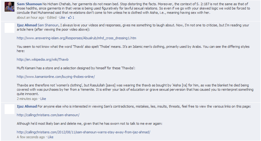 Unfortunately, Sam decided that he preferred not to respond and chose to delete and subsequently block me from commenting on his page. I see Christians who on a daily basis, run to Shamoun for help, they praise and glorify him, but here he is, running from Muslims. In fact, another Muslim (convert from Christianity), Br. Abdul Khaliq (read his apostasy from Christianity and acceptance of Islam here), who also began to comment on this comment thread was also blocked from further commenting. Why is Sam Shamoun afraid of discussing his beliefs and claims with Muslims? What has he to hide?
