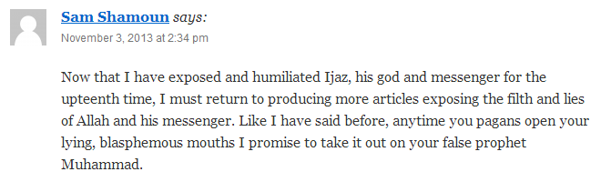 Muslims are not afraid of debating scam Shamoun, after all, many of us have engaged him. Yet, as Sam himself has admitted, he’s unwilling to have a moderated discussion with Muslims, for if they speak on anything, regardless of the topic, he’d abuse the Islamic Prophet. As a Christian, I ask, how would you feel if every time you attempted to speak to a Muslim, he had only nasty and vile comments about Jesus the Christ. Wouldn’t that off put you on discussing anything with Muslims? Similarly, Muslims aren’t afraid of Sam, we’re just not willing to listen to a Christian sit and abuse our Prophet, it’s a common courtesy that if you’re having an inter-religious discourse, you try to respectfully convey your disagreements, but you do not intentionally go out of your way to abuse and mock the other persons’s faith.