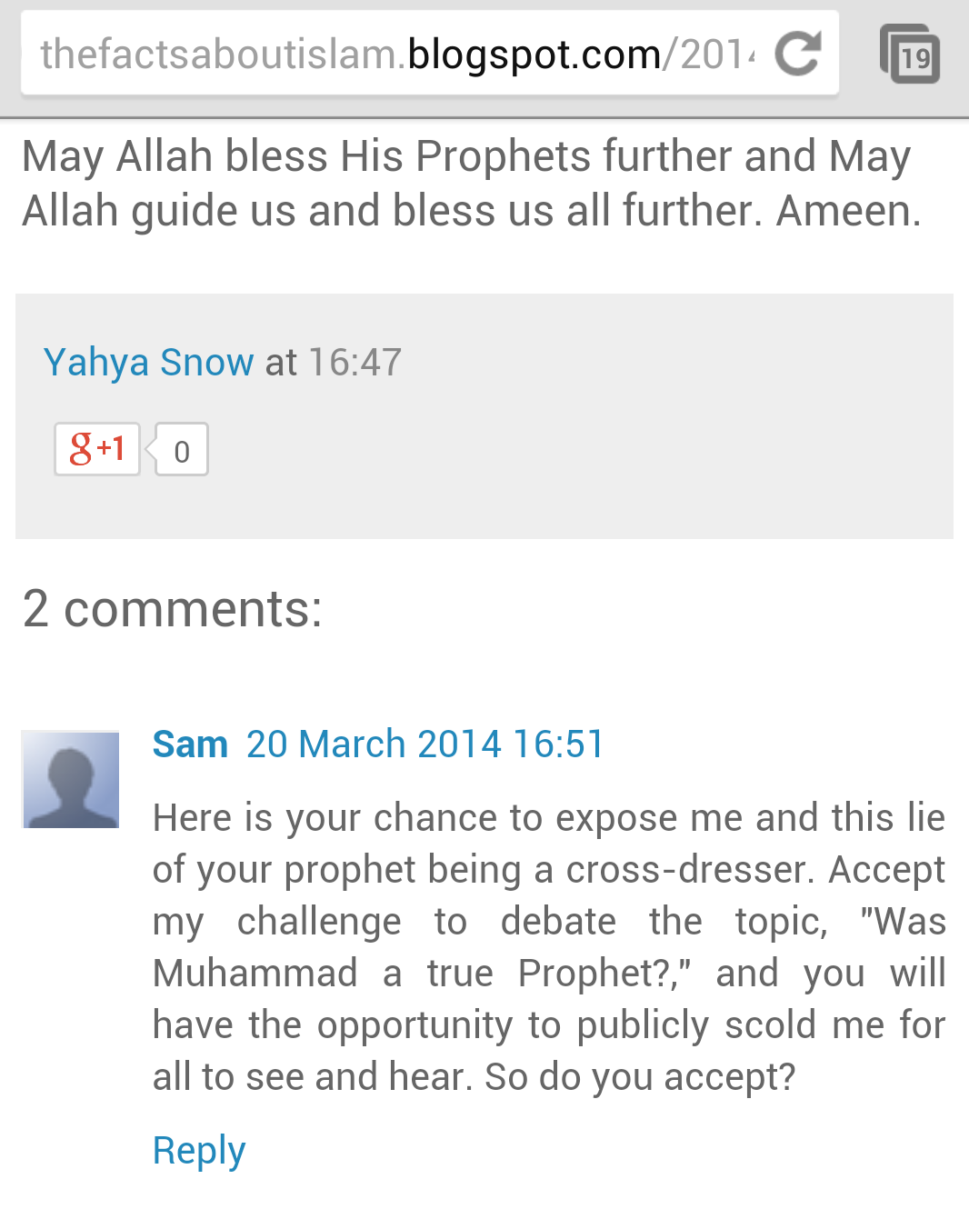 Sam Shamoun has posted on Br. Yahya Snow’s website, that the claim that Muhammad (salallaahu alayhi wa salam) cross dressed, which he uses himself, is indeed a lie: