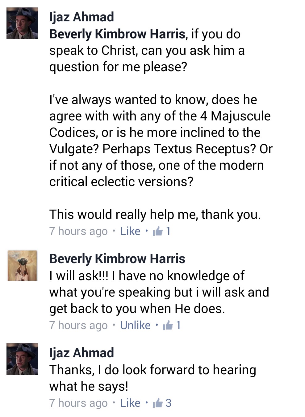 So, I meet this lady who says she talks to Jesus all the time! I decide to ask for her expertise since she has a direct line to the one guy that can help us solve our textual challenges with the New Testament. She says she’ll ask him about it. What are the chances I should expect a reply?