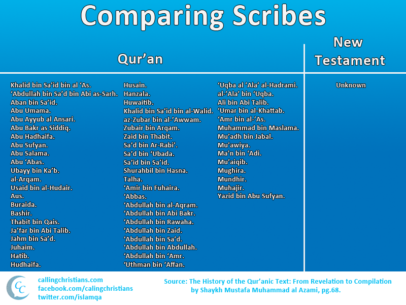 A quick comparison on the identities of the scribes of the Qur’an and the scribe(s) of the New Testament. Quite the disparity!