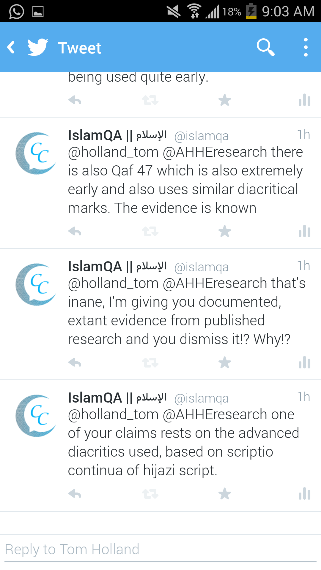 Most people are aware that Tom Holland is a historian, most people are also aware that he is not a palaeographer, nor a papyrologist, nor has he studied Arabic codicology. Therefore, finding him being referenced as an academic source regarding the Birmingham manuscripts was extremely strange. I decided to tweet Tom and get some answers.