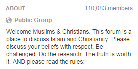 If I’m reading this correctly, this is a group created for the purpose of Muslim and Christian Discussion. Just to ensure I’m understanding this, I checked the group’s “about” definition: